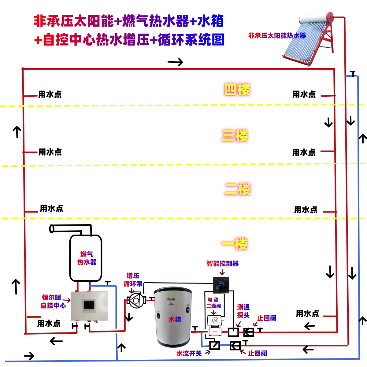 增壓熱水主管安裝自吸變頻增壓泵(帶缺水保護(hù)),多龍頭同時(shí)開不降壓,頂樓花灑也能噴出水柱特別主熱水器是非承壓太陽能時(shí),必須安裝