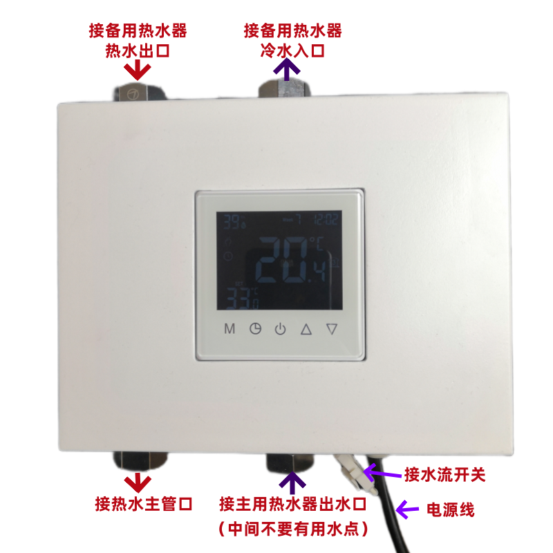 恒爾暖自控中心的安裝也很簡單。四個水口簡單對接一下就可以了。右下口利用管道接主熱水器出水口,這個中間不要有用水點,左下口接熱水主管,右上口接備用熱水器冷水入口,左上口接備用熱水器熱水出口。