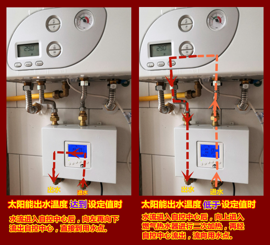 陽臺壁掛太陽能和燃氣熱水器組合做零冷水系統(tǒng),配裝恒爾暖自控中心,實現(xiàn)了主用太陽能,備用燃氣,既做到即開即有熱水,又做到最大的節(jié)能環(huán)保,使家用熱水舒適方便又節(jié)能。